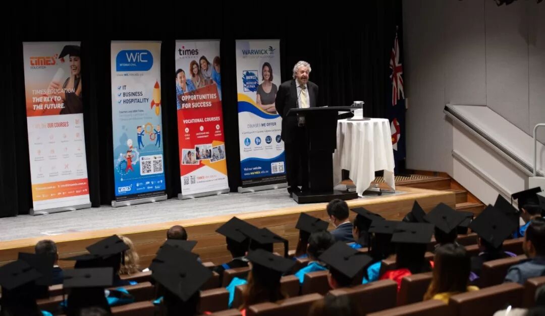 我们很荣幸的邀请到 UTS 大学的资深讲师 Dr.David Beirman 做为典礼嘉宾,以及时代教育校长 Heidi Reid, 布里斯班校区校长 Attila Gaspar 和伯克利商学院的教务主任 Shuvagata Roy 依序上台致词给与学生们勉励与祝福。